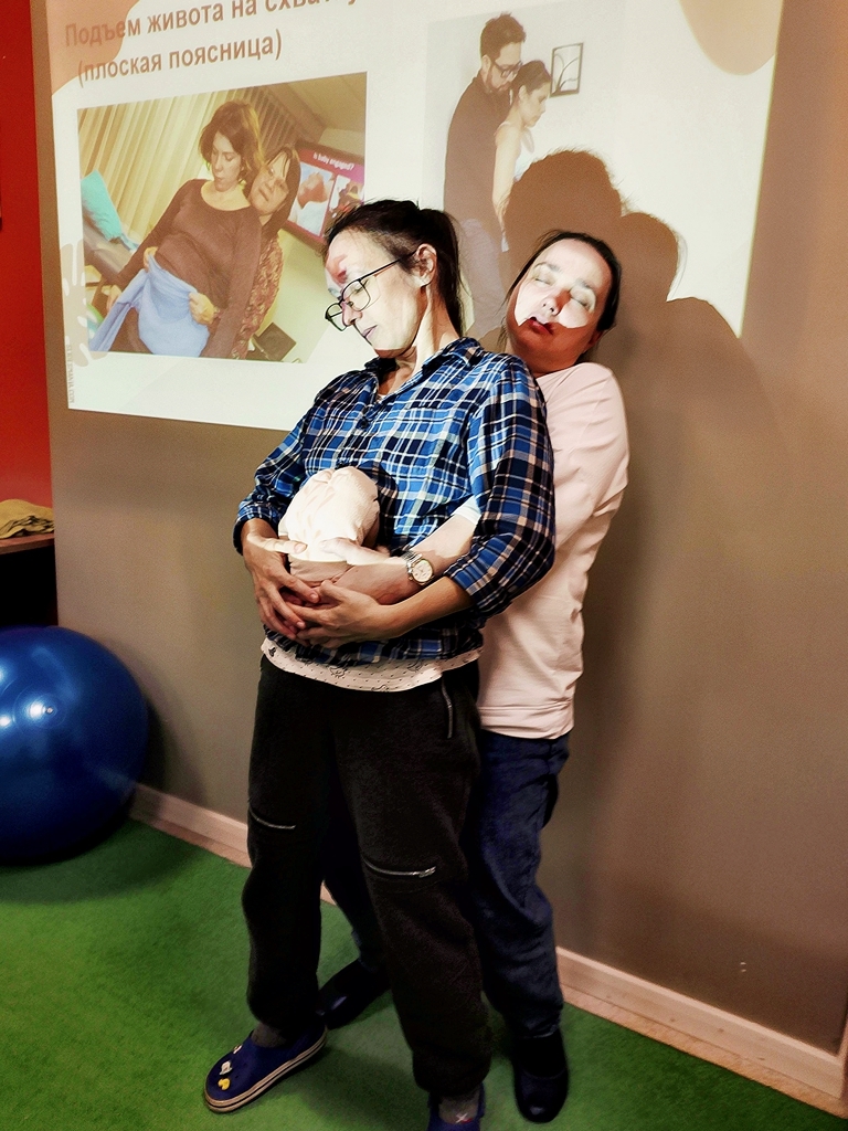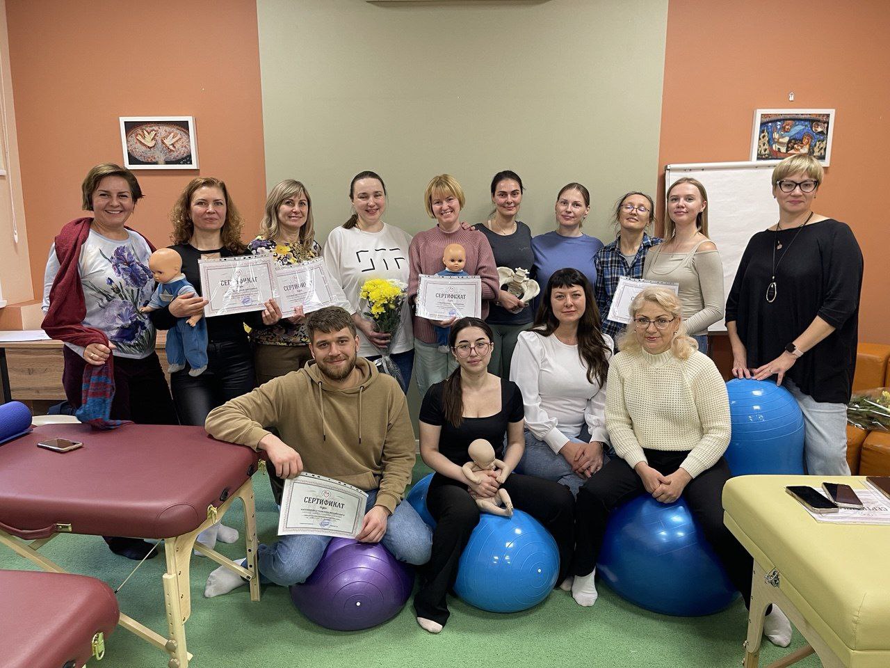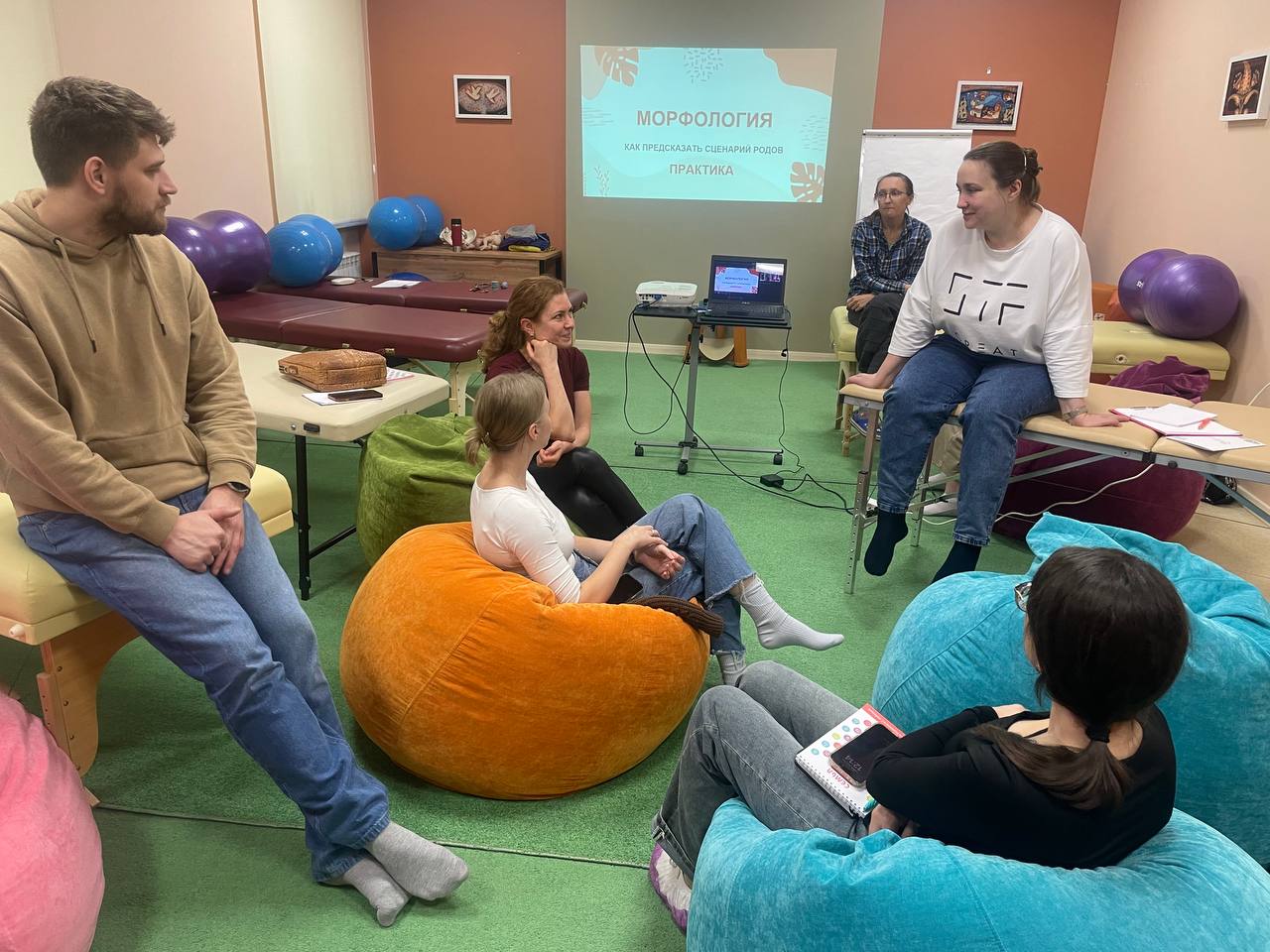 Второй день был полностью посвящён практическому применению полученных знаний. Участники работали в мини-группах, отрабатывая техники, которые можно использовать как в родильном зале, так и дома:
